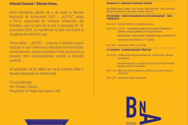 Bienala Naţională de Arhitectură 2025 – „ALTFEL”, ediţia a XVI-a, organizată de Uniunea Arhitecţilor din România, va avea loc la laşi, în perioada 30-31 octombrie…