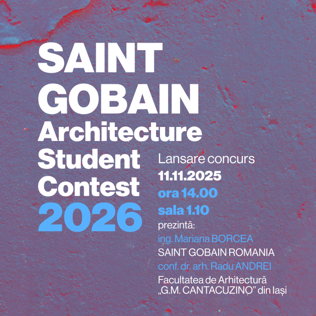 Marți, 11.11.2025, ora 14.00 în sala anului IV (1.10), va avea loc lansarea concursului SAINT GOBAIN Architecture Student Contest 2026.